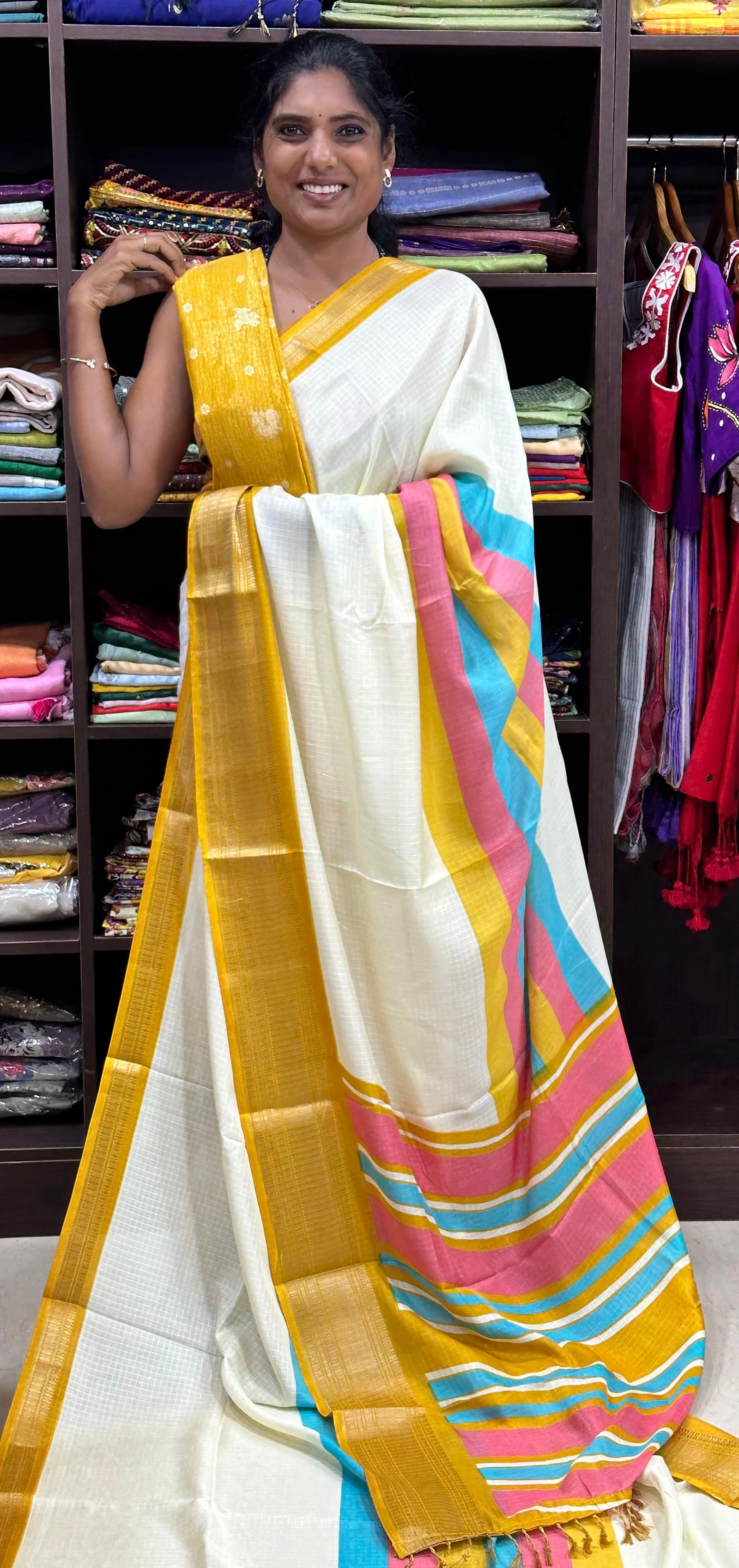 Checked design all over saree with contrast pallu and zari border, finished with tussals
