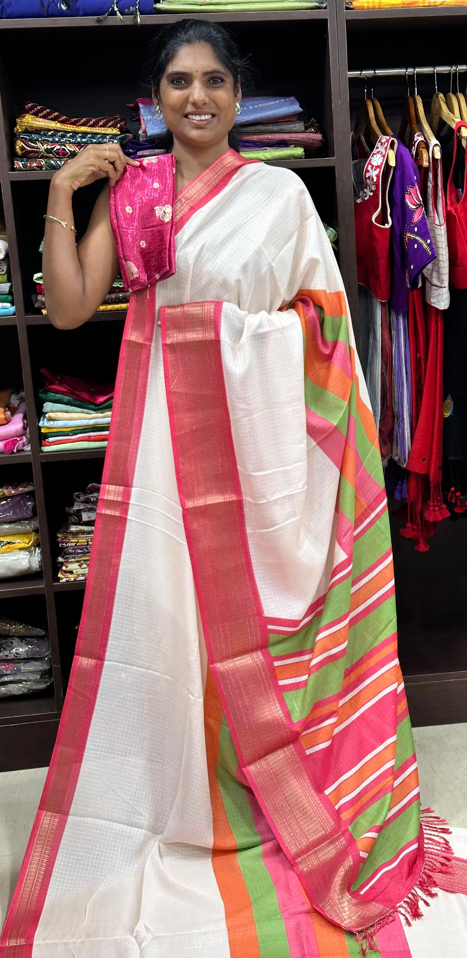 Checked design all over saree with contrast pallu and zari border, finished with tussals