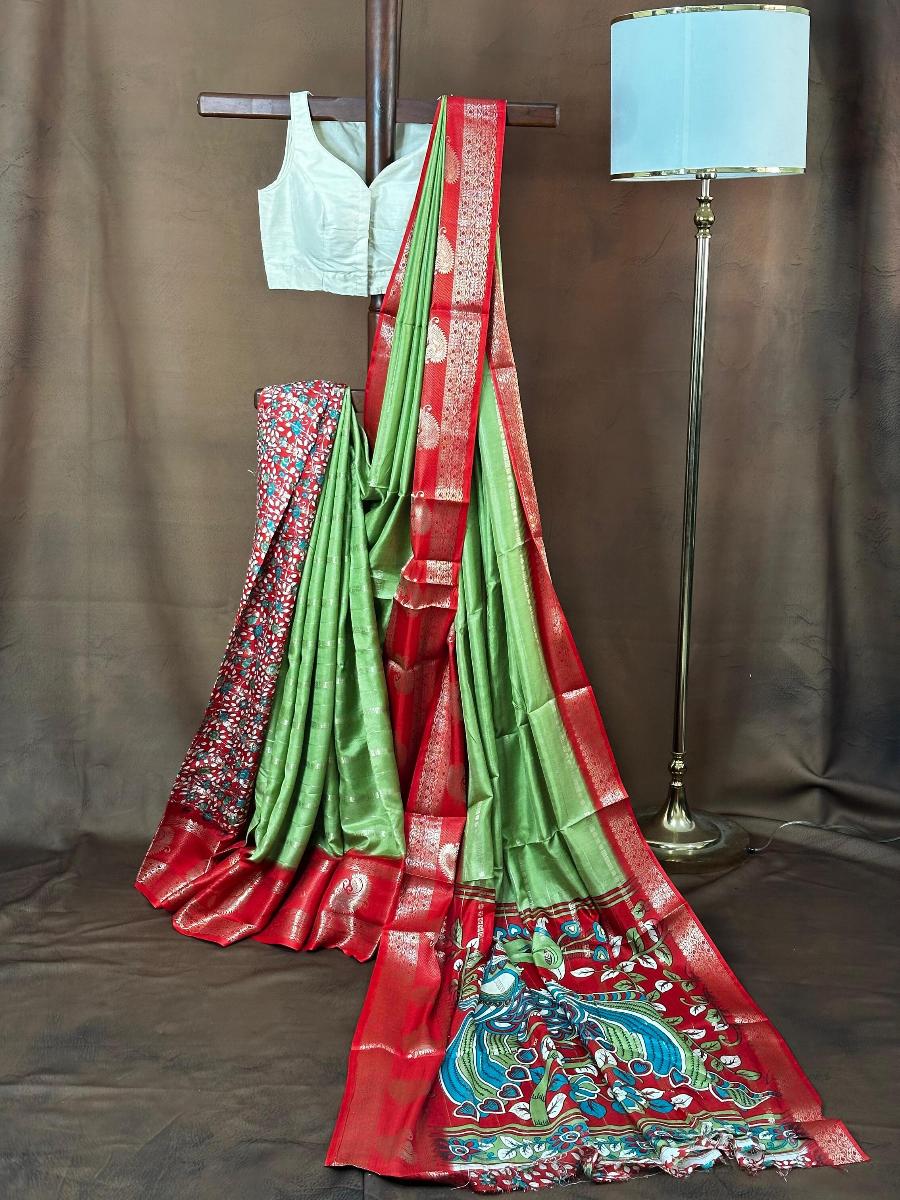 Binni silk have velthari zari pattern all over body with retta petta border and peacock motif kalamkari pallu