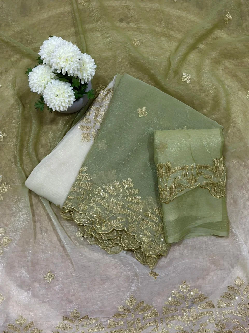 Crush Chiffon saree with sequence buttas all over body along with designer cut work border