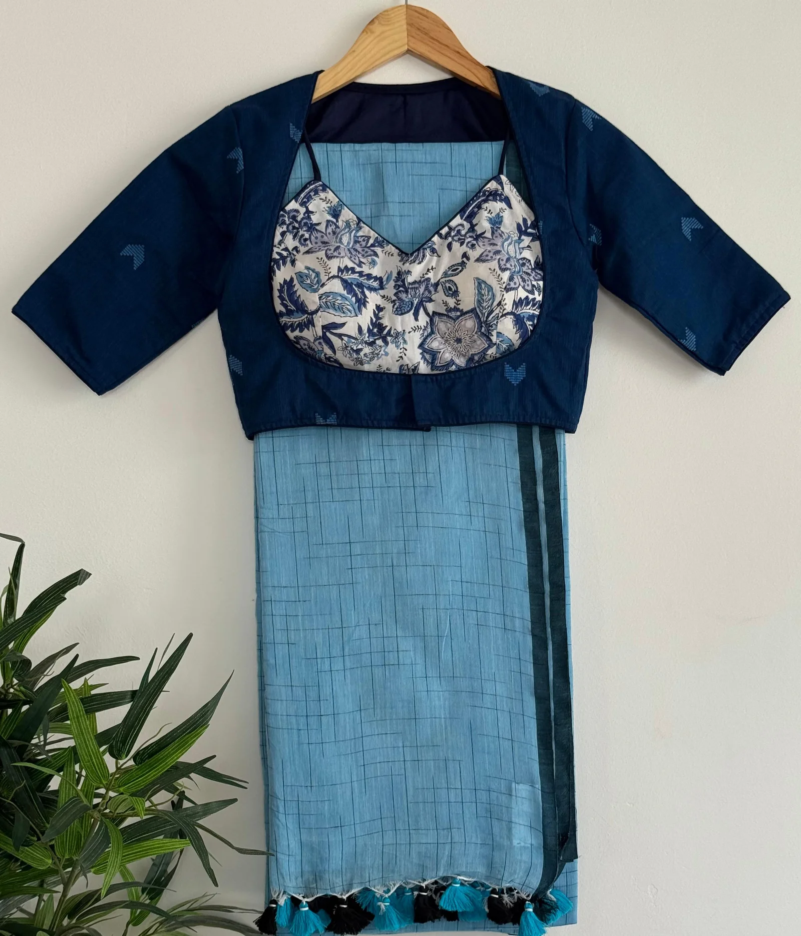 Blouse:Beautiful cotton blouse have front V neck and back high neck ,front hook,elbow sleeves,padded gives unique look