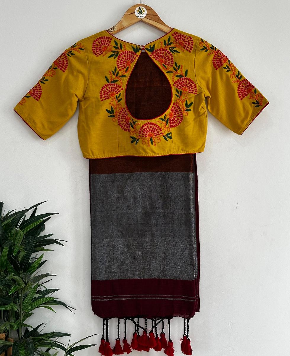 Blouse:Trendy cotton blouse with beautiful floral embroidery on sleeves and back,front U neck,Back high neck with open,front hook,elbow sleeves gives a comfort look and fit