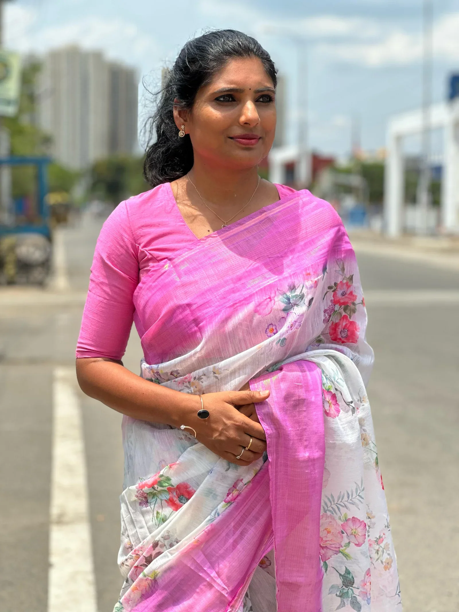 Work - Semi Linen with floral digital print and contrast border