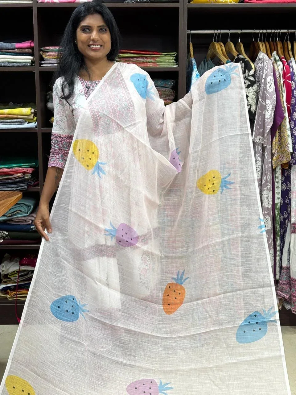 Soft linen cotton with exclusive fruit pattern body along checked Pallu