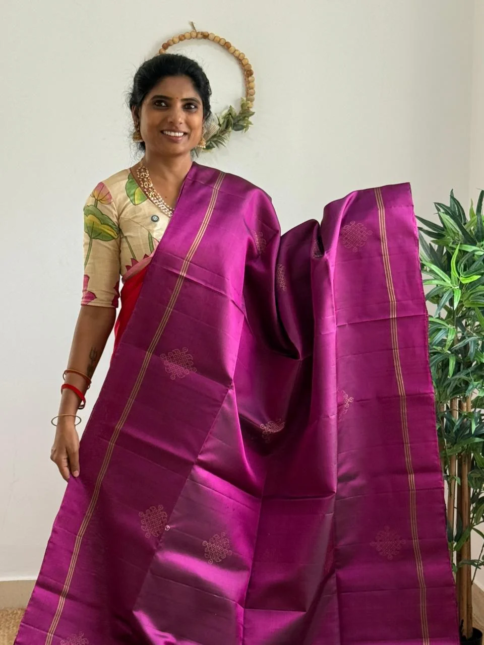 Pure Handwoven Kanchipuram Soft Silk with kolam design and traditional Pallu