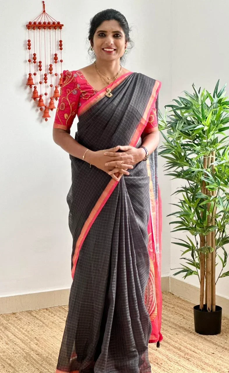 Soft Semi linen cotton have checked body with contrast border and kalamkari pallu