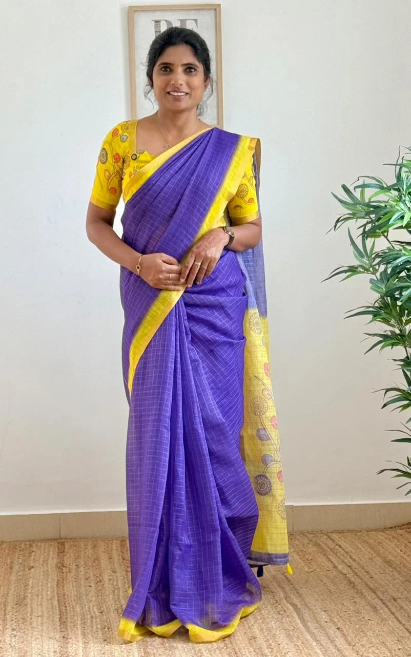 Soft Semi linen cotton have checked body with contrast border and kalamkari pallu