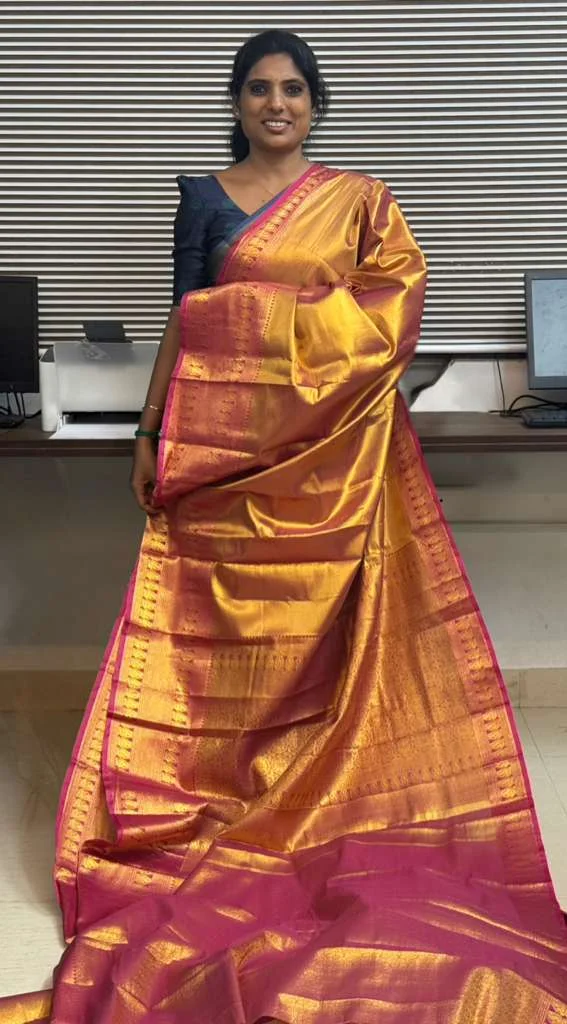 Semi Tissue Kanchipuram silk saree with rich golden body along with peacock woven zari border and pallu