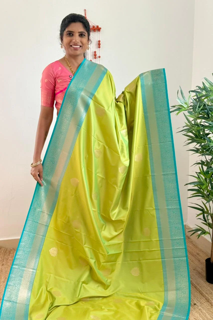 Semi Kanchipuram soft silk with beautiful zari motifs all over with retta petta zari woven border and rich pallu