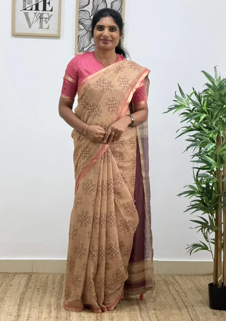 Beautiful kolam printed semi linen cotton saree with contrast zari border and contrast pallu