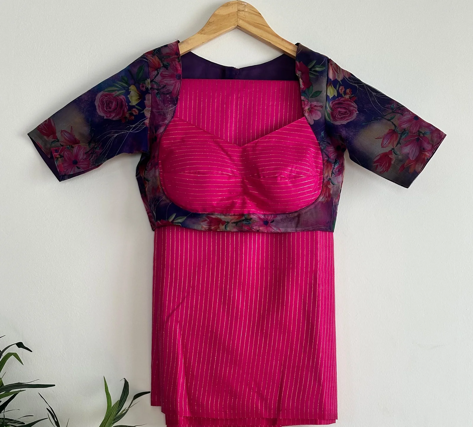 Blouse:Beautiful Organza printed blouse have front pencil neck,back high neck,back hook, elbow Sleeves,padded gives trendy look