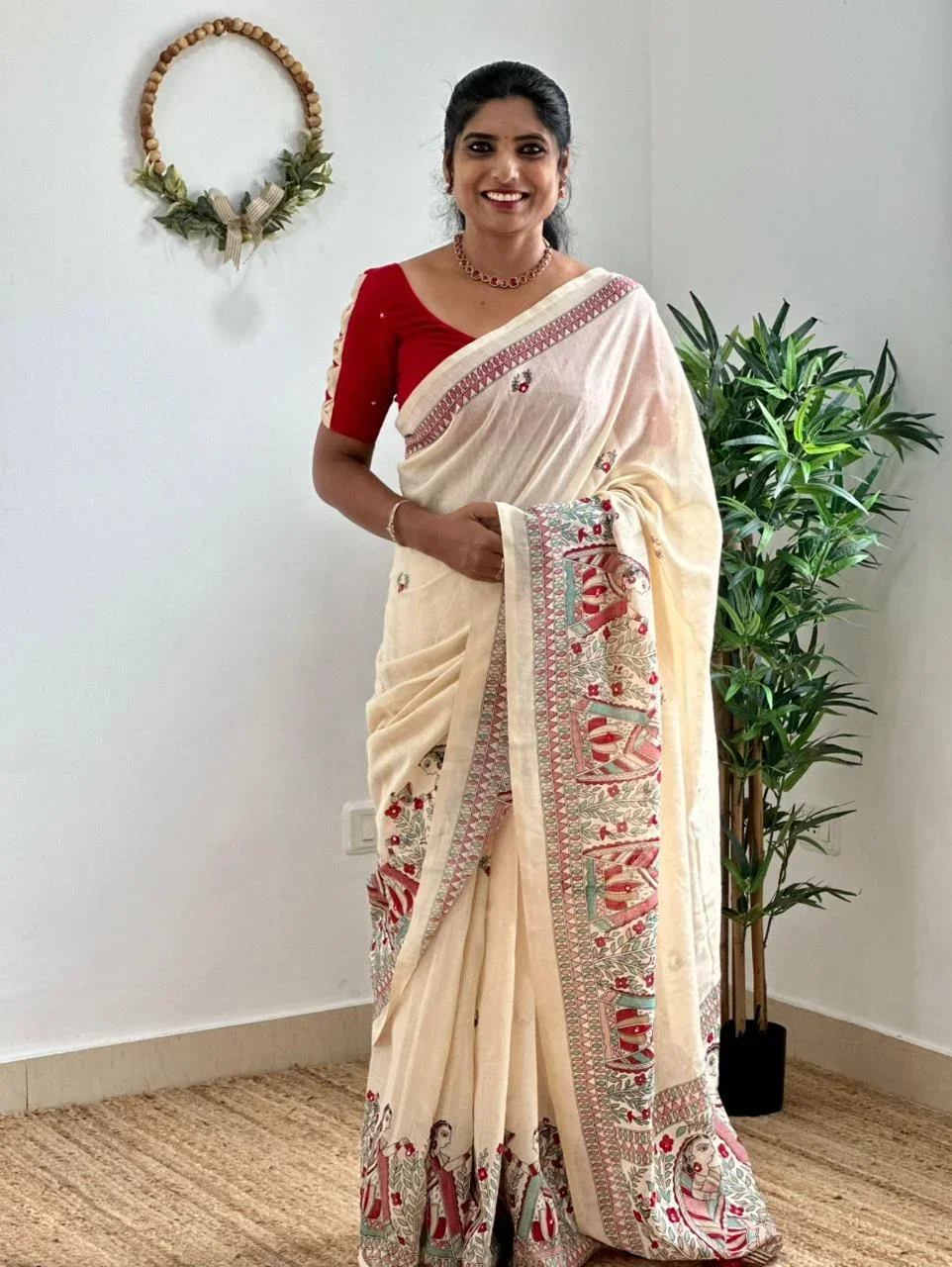 Soft Semi linen cotton saree with Madhubani prints and foil mirror work