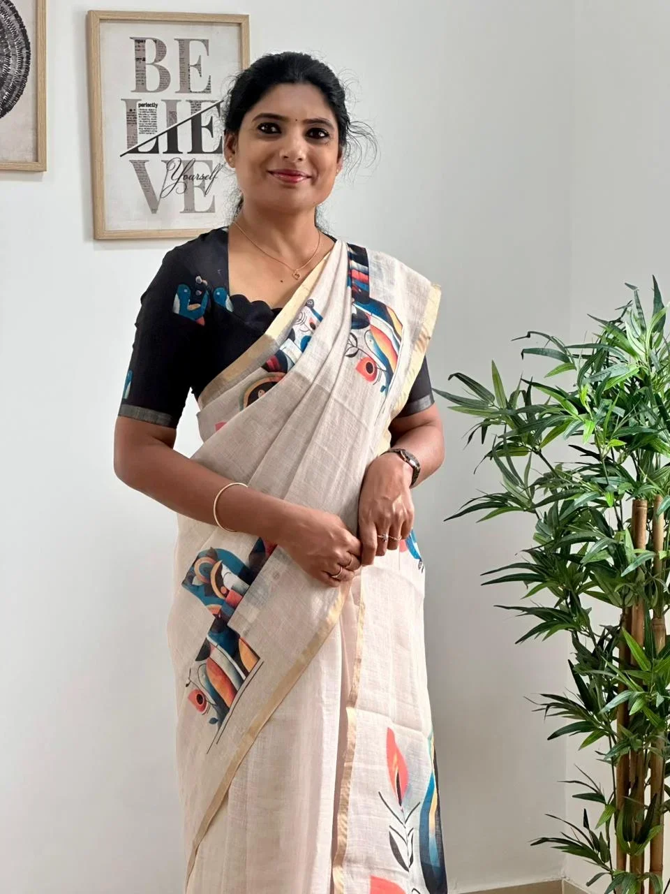 Beautiful printed Radhe Krishna linen cotton saree with gold zari woven slim border with astonishing Pallu