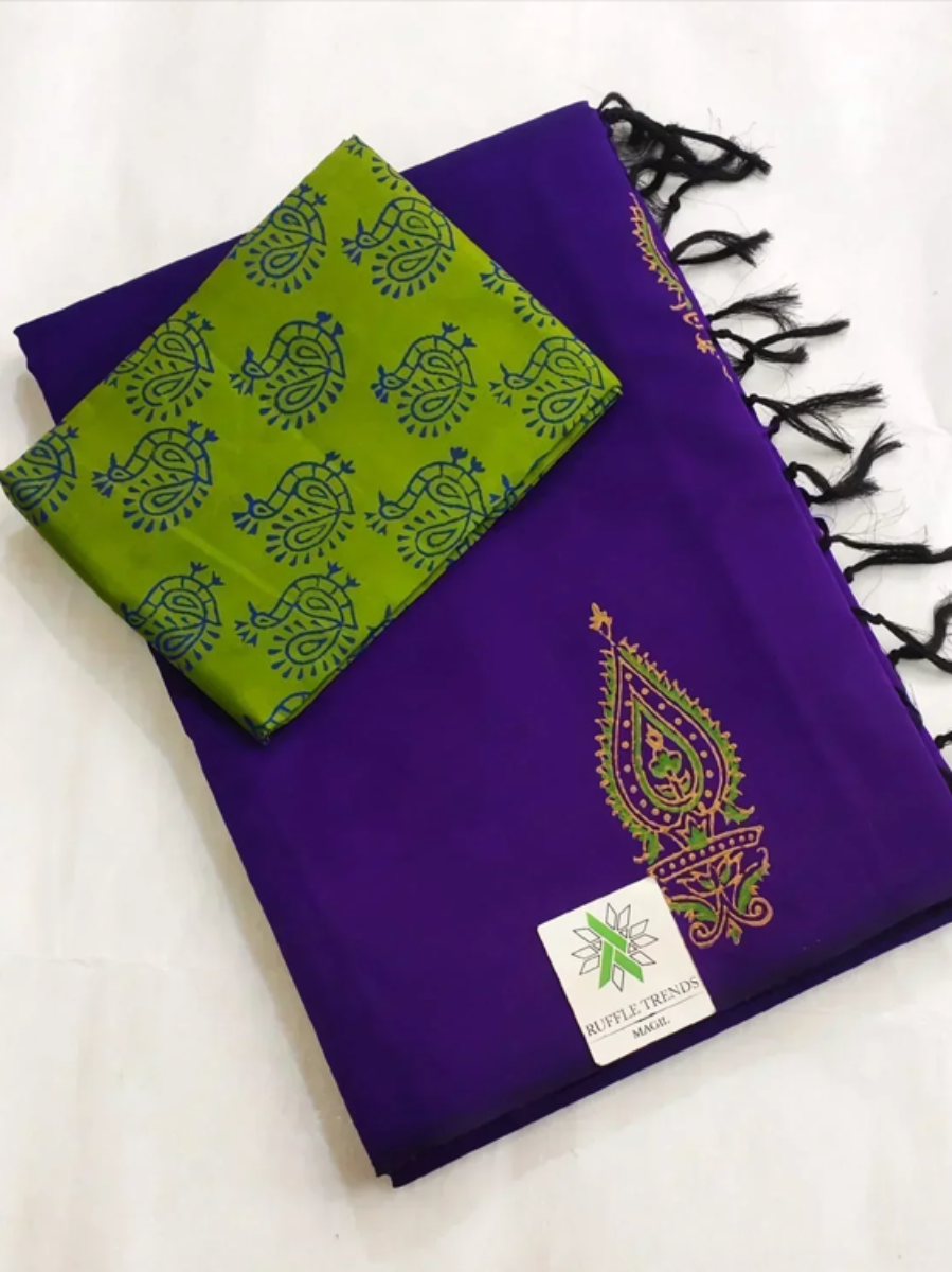 Block printed cotton saree with contrast blouse.