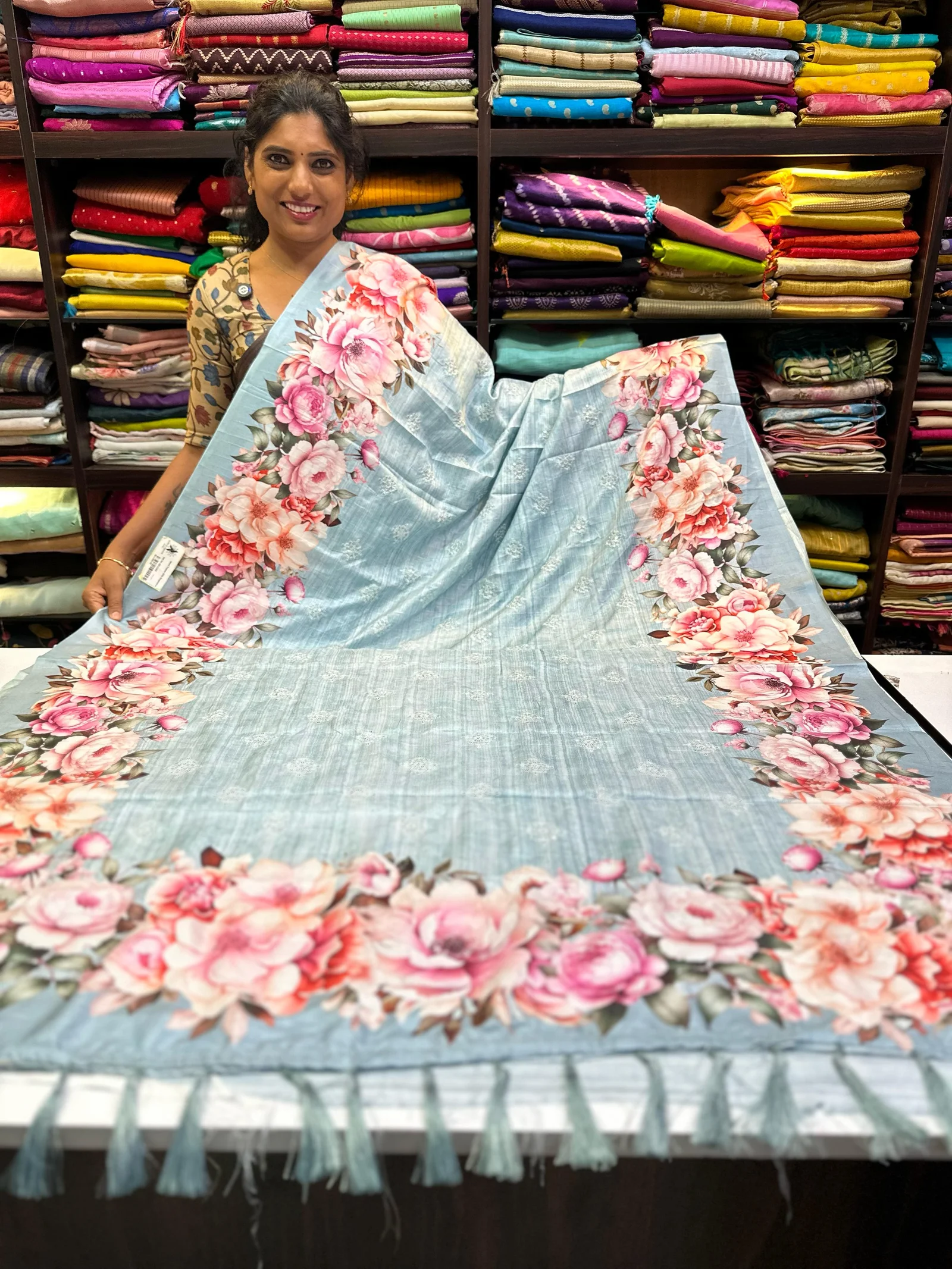 Tussar silk have plain body, digital printed floral work border and digital printed pallu with tussals
