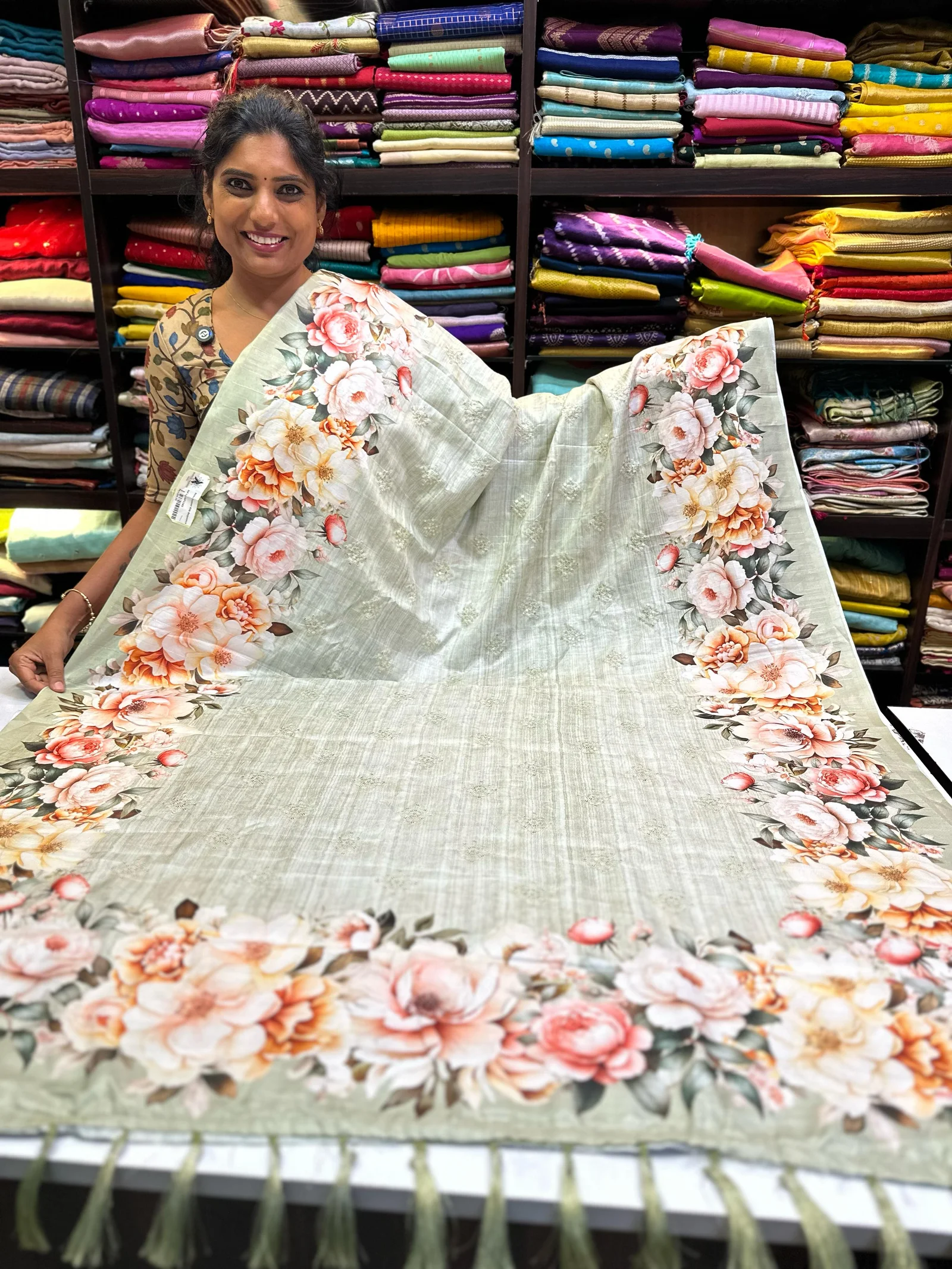 Tussar silk have plain body, digital printed floral work border and digital printed pallu with tussals