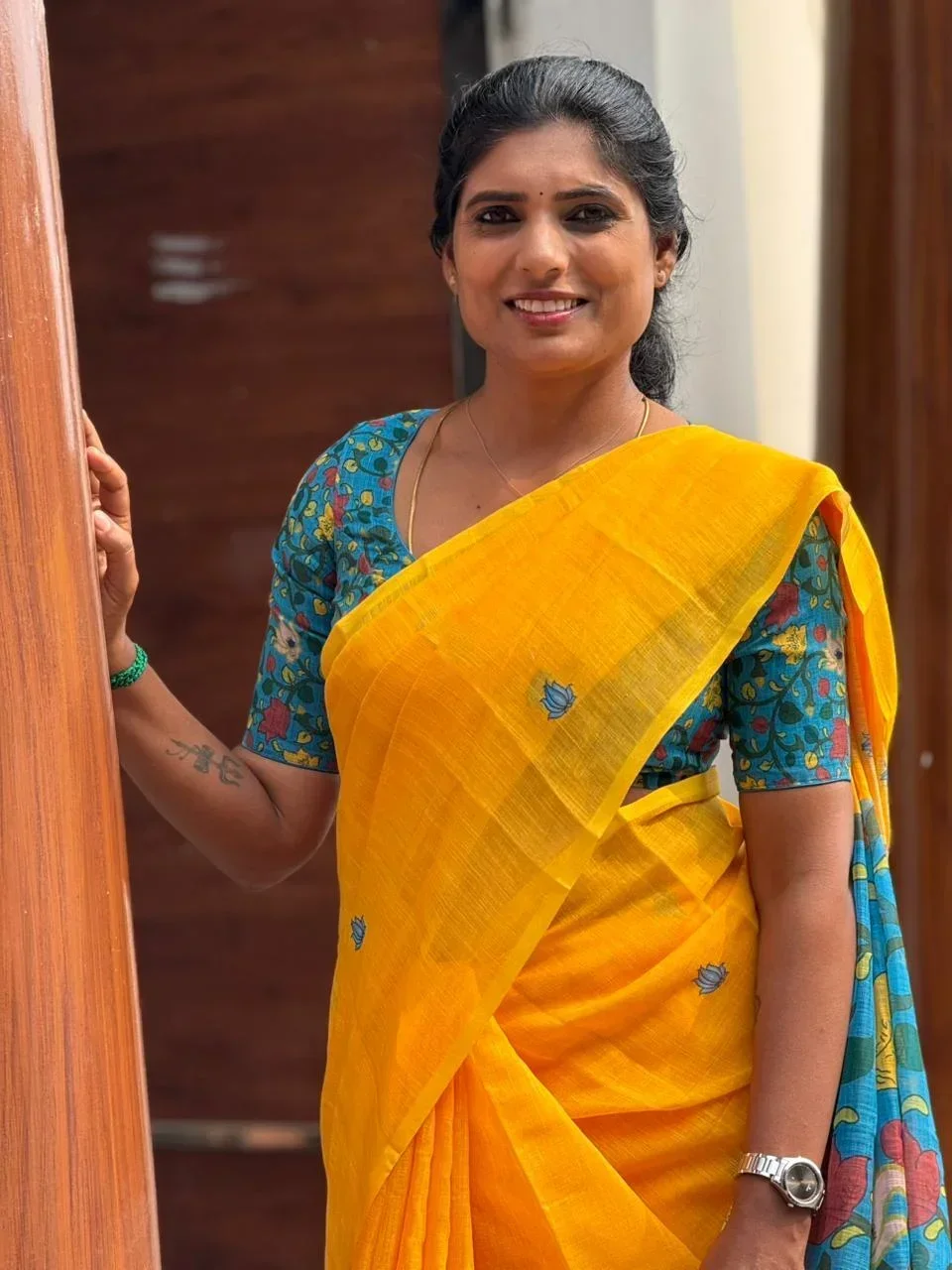 Trendy floral linen blend cotton saree with kalamkari pallu and finished with tassels